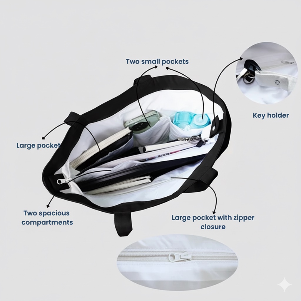 The Tote Bag is crafted from 100% cotton fabric, our large everyday tote bag combines durability with a soft touch. Inside, the tote features two smaller pockets, a zippered inner pocket, and a dedicated water bottle holder to meet all your needs. The inner nylon fabric enhances the bag’s longevity, making it a reliable choice for everyday use.