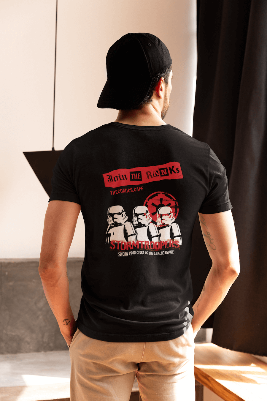 The design features a bold imperial insignia woven into a modern streetwear aesthetic—clean lines, high-contrast graphics, and a sense of dark minimalism. Whether it’s a stormtrooper helmet silhouette, Darth Vader’s outline in the shadows, or the words “Join the Empire” in stylized Galactic Basic script—every element is a statement of purpose.