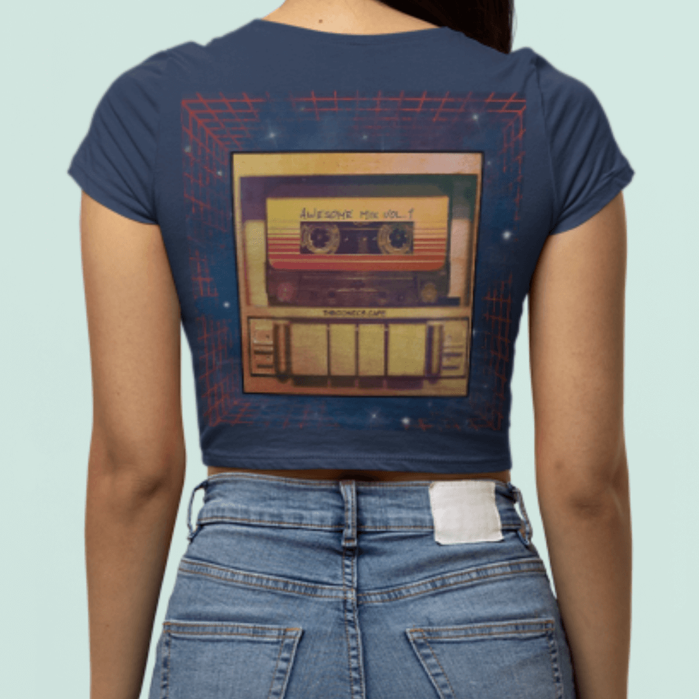 Guardians of Galaxy Starlord personal favorite Awesome Mix Cassette printed Crop Top. The Comics Cafe Crop-Top is double-stitched, 180 GSM, bio-washed cotton fabrics.